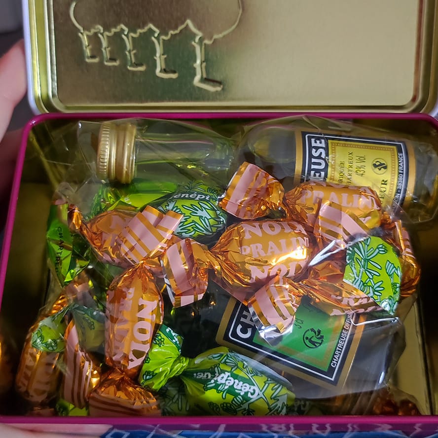 Mes places en poche, je branche le collègue Benoît qui était complètement zinzin que Juliette vienne chanter dans sa montagne. Je me suis dit que j’allais essayer de faire un nouveau cadeau à Juliette (je suis irréductible) et cette fois-ci, j’allais apporter pour toute l’équipe les bonnes choses de la région, à savoir la Chartreuse et le chocolat Bonnat, qui font notre réputation. Pour la blague, je lui avais aussi préparé un débardeur pimpé « J’ai fais Bercy, putain! ».